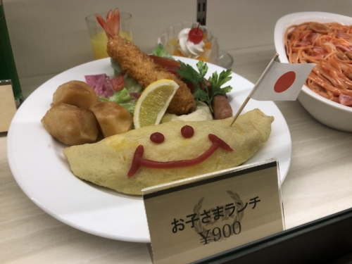 レストランカミヤのエントランスの前には、洋食屋らしい趣のあるフードサンプルが展示されています。料理のプレゼンテーションやサイズなどが忠実に再現されていて、メニュー選びの参考になりました。