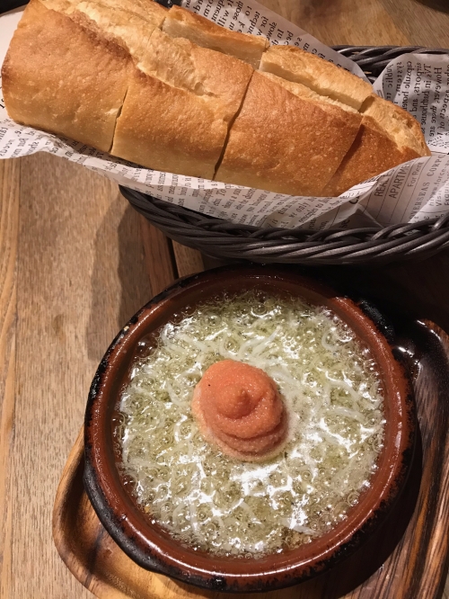 シラスと明太子のアヒージョ(660円)は混ぜてから頂きましょう。ハーフバゲット(490円)も一緒にオーダーして、パンにたっぷり付けて頂けばお腹も満たす一品に。熱々で出てくるので、火傷に注意しましょう。ブルサンチーズ(1,190円)は、ハーフ(720円)でもオーダー出来るので、少人数の方におすすめ。