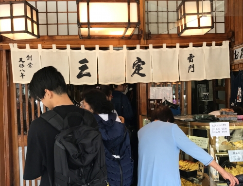 創業天保8年、天麩羅の老舗「雷門三定(さんさだ)」。胡麻油で揚げた江戸前のかき揚げが名物です。店外でも天麩羅などが販売されていて、テイクアウトも出来ます。えび天おにぎりは、タレがご飯に絡みボリューム満点です。