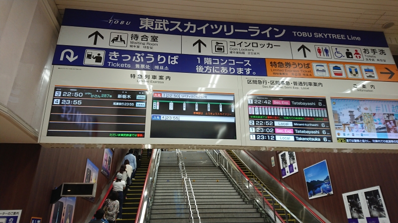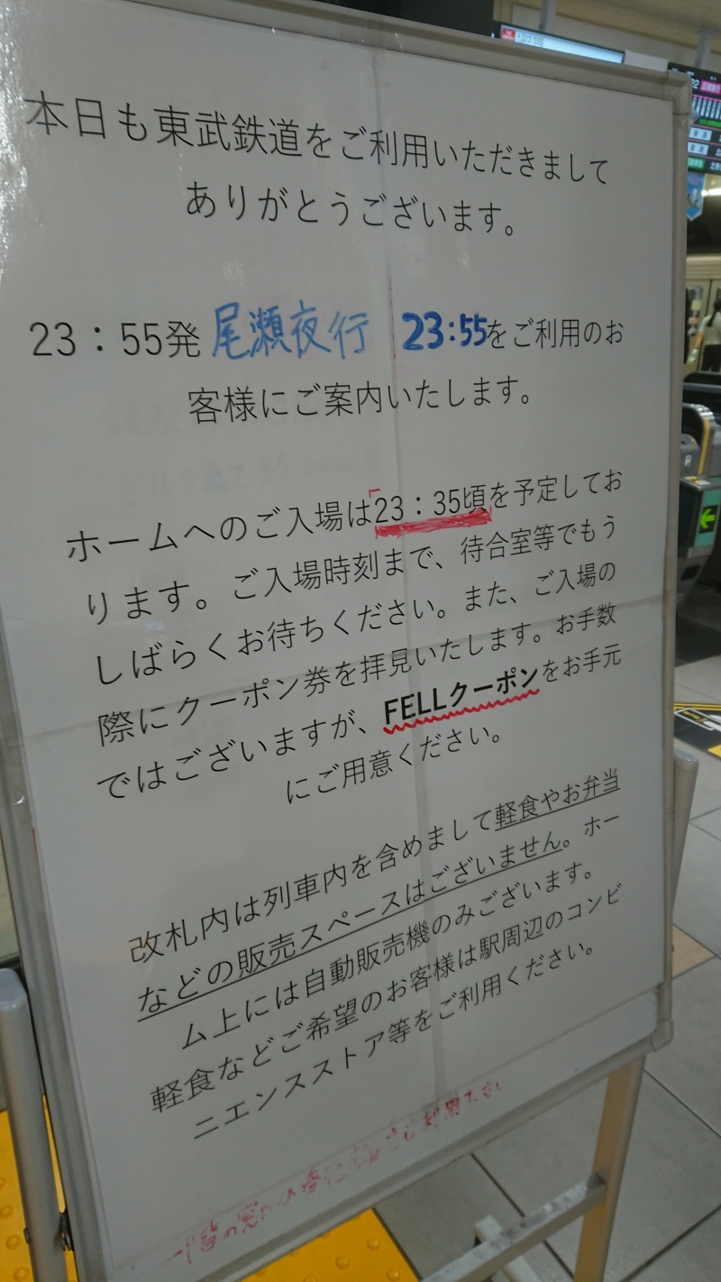 浅草駅の建物内に入ると、大きな電光掲示板の左端に、4番線乗り場、尾瀬夜行23:55の表示が!