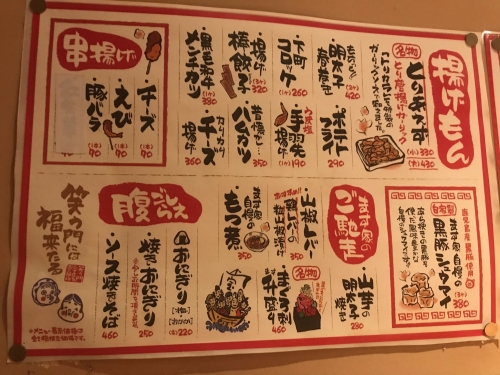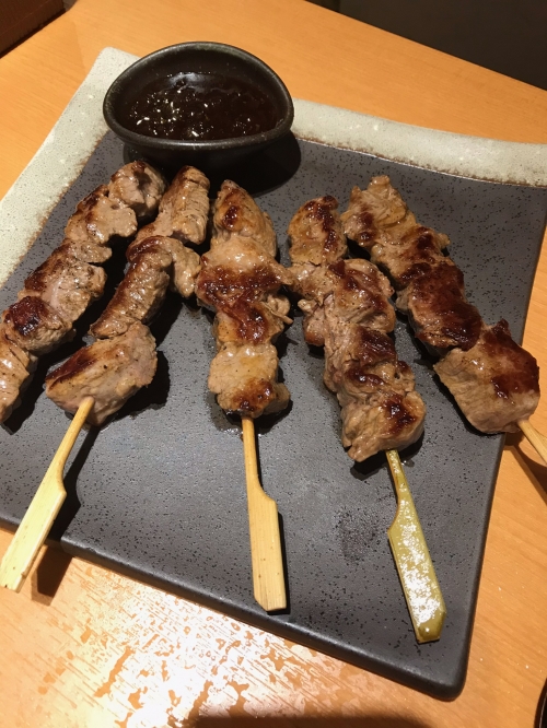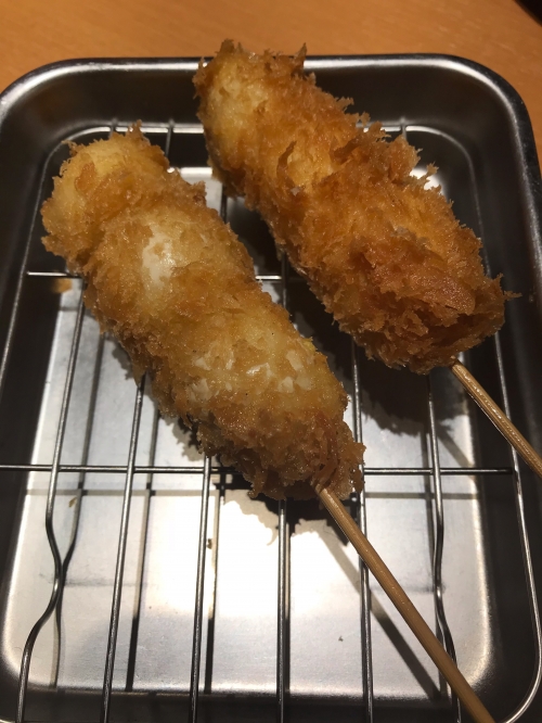 焼き物は、1本からオーダー出来るので、色々な種類をオーダーする事が出来ます。ししとうは1串に5本のししとうが刺さっています。みんなが好きなうずらフライ(¥150)は、1串に3個刺さっているので、串を外してみんなでシェアするのにも良いでしょう。5串も入っている牛串特盛(¥950)は、まずはそのまま、次にタレをつけて頂きましょう。