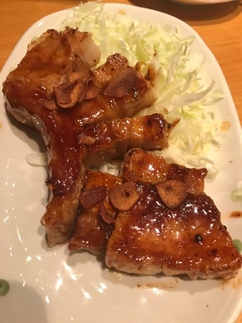 甘辛い味のトンテキは、ハーフサイズ(¥500)もあるので、ちょっとつまみたい人におすすめ。ゴマとネギがたっぷりかかった、ごま塩レバー(¥400)はレバーが苦手な人にも人気。