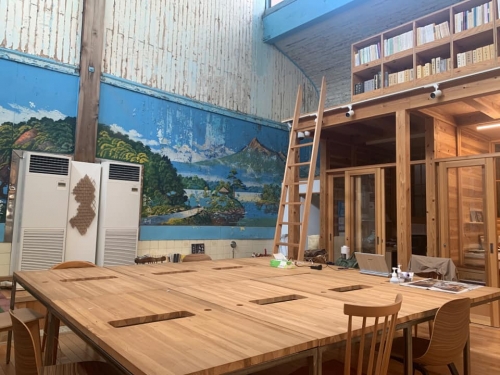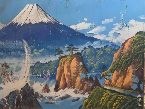 もともとの洗い場部分に机が置かれ、壁には立派な富士山のペンキ絵が当時のまま残されています。