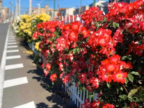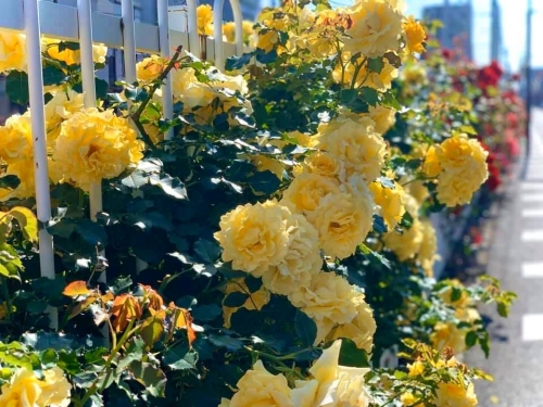 区内の約4.8kmのうち、現在は植栽可能な約4kmの区間に140種13,000株ほどが植え込まれていて、春や秋にはカラフルなバラが咲き誇り、沿線を華やかに彩ります。