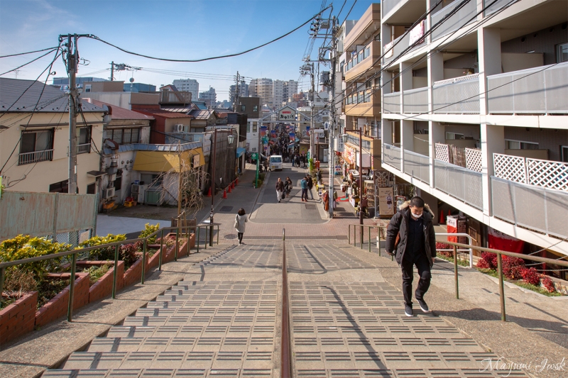 「谷中せんべい」を出てそのまま進んで行くと、谷中のランドマーク的な階段「夕やけだんだん」の上に到着します。夕方になるとここから綺麗な夕日が見えることから、この名が付けられました。この階段を下りた所から約200m足らずの商店街が続いています。