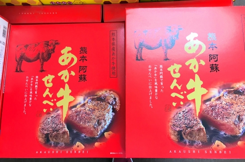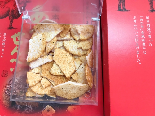 阿蘇名物・あか牛を風味豊かなせんべいに仕立て上げた「あか牛せんべい」です。試食もあるので、ぜひお試しくださいね。