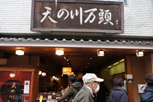 温泉まんじゅう屋さんがひしめき合う中にあって、珍しい「酒まんじゅう」の文字に思わず足を止めてしまう、和菓子村上。