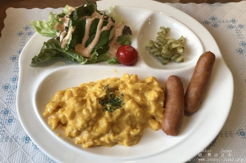 朝食はコーンクリームスープ、スクランブルエッグ、サラダ、ソーセージ、パンなどが付く洋食メニューでした。朝食も十分お腹いっぱいになるボリュームですので、朝から沢山食べる方でも満足できます。