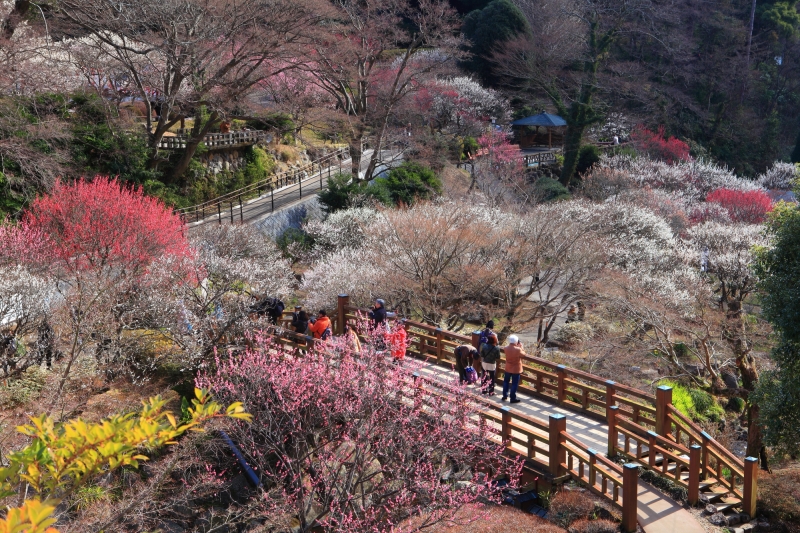 明治19年(1886年)に開園。毎年1月上旬から3月上旬にかけて「熱海梅園梅まつり」が開催され、園内に植えられている梅が次々と咲き誇るため、冬の観光にもぴったり。樹齢100年を越える梅の古木を含め60品種・469本、早咲きから遅咲きまで植えられているため、さまざまな梅の花を長い期間楽しむことができます。おまつり期間中は、甘酒の無料配布や足湯も利用できますよ。