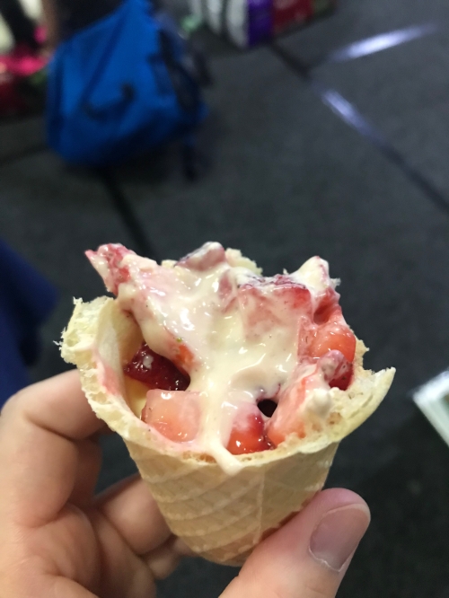 EKKAでの名物と言われるほどポピュラーないちごのサンデー。上から「いちご」「生クリーム」「いちごアイス」「ダイス状にカットされたいちご」(結構ゴロゴロ入っています!)「バニラアイス」と、比較的小さなカップの中に5層にもなっています。アイスはとても濃厚!一番上に置かれたいちごは、受け取ってすぐに残念ながら地面に落としている人がいたので、気をつけてくださいね。