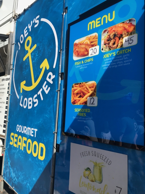 JOEY'S LOBSTERというお店の一品。大きなロブスターミートがゴロンと4切れ乗っています。ソースはちょっとスパイシーなソースで、ロブスターとよく合います。食べ応えがある一品ですが、ロブスターの下に野菜が敷いてあるので、くどさを感じずに食べられます。同じお店には、フィッシュバーガーや、海老のロールもありました。