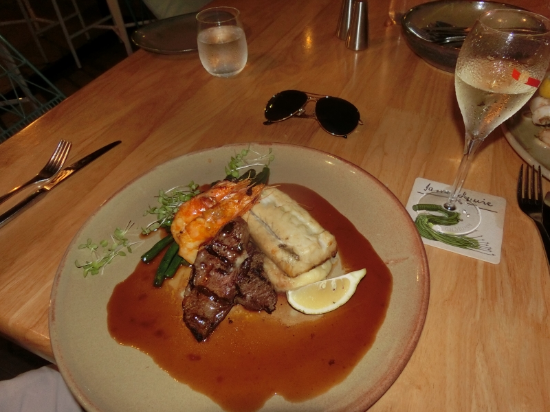その一品というのがこれ。ケアンズならではの食材が、ワンプレートに凝縮された、その名も「テイスト・オブ・ケアンズ」です。カンガルー肉のステーキ、絶品の白身魚バラマンディ、獲れたてのエビを、パンチェッタ・インゲン・マッシュポテトと共に、一つのお皿に盛りつけたこのメニュー。