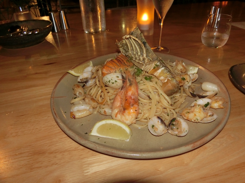 お肉もいいけれど、お店の名前が「ボートシェッド」だけにシーフード気分という時は、この写真のパスタ、2人前の「ミックスシーフード・リングイニ」がオススメです。アサリに似た貝ピピ、ロブスターっぽいプリプリの身のバグ、ムール貝、エビ、イカの入った海の幸満開のパスタです。
