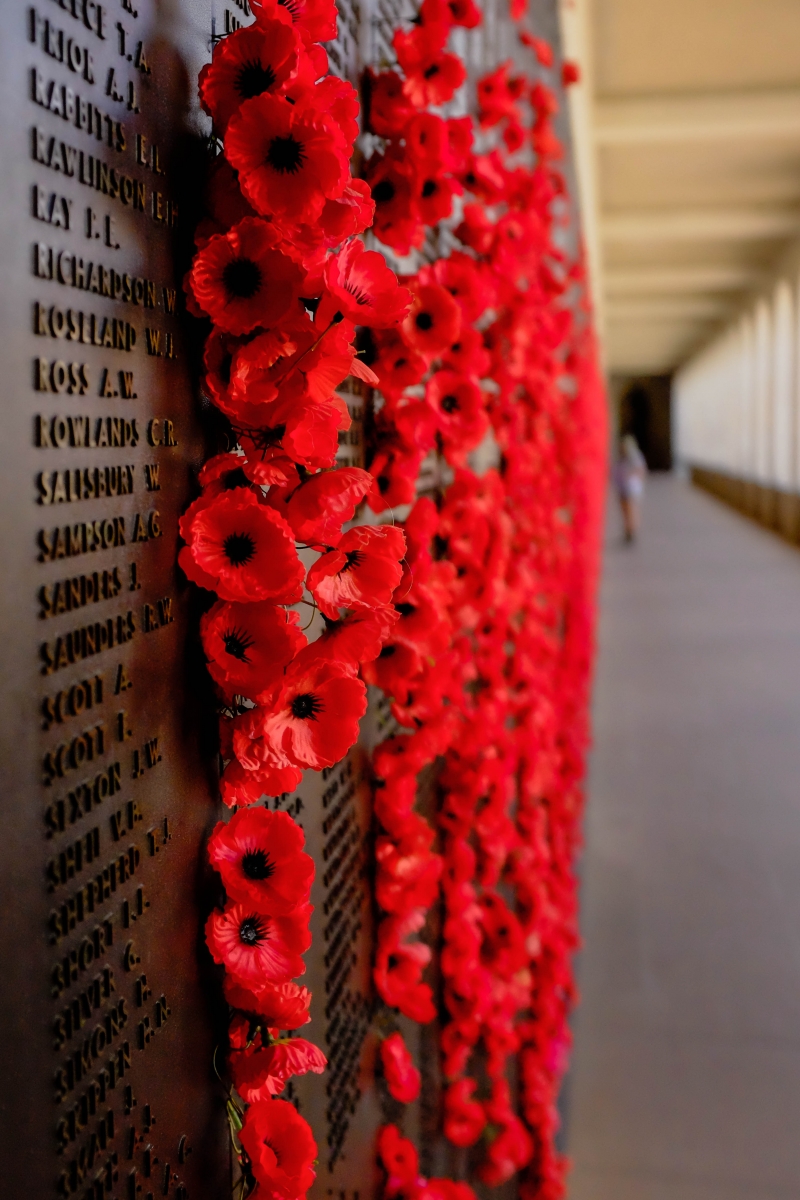 中庭の上の回廊の壁には、国のために犠牲となった人々の名前が書かれています。額の周りの隙間には、友人や遺族によってポピーの花が供えられています。ポピーの花はオーストラリアだけではなく、かつて連邦国として戦った国々にとって共通のシンボルでもあります。