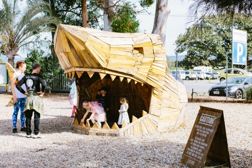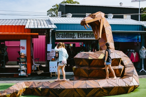 マーケット内を歩いていると、ふと気づくのが、この木で作られた動物たち。それもかなり大きんです。子どもたちが登って遊べるようにもなっています。大きな敷地内を回って、彼らを探してみては。