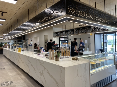 大きなカウンターでは、フードディスプレーがされていて、こちらでフードオーダーもできます。その手前はガラス張りになっていて、隣接するチーズ工場のチーズの発酵過程を見ることが出来ます。