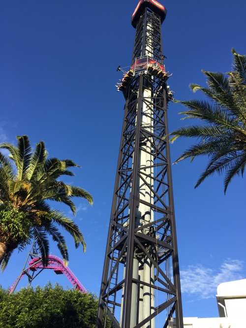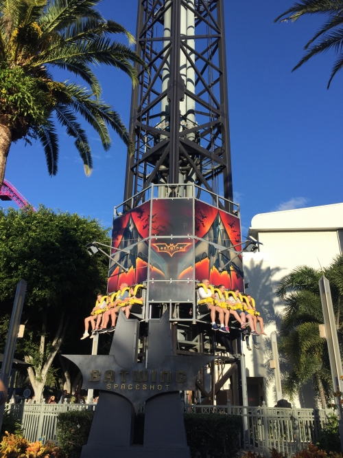 一瞬にして60メートル上空へと突き抜ける「バトウィング・スペースショット」は、バンジージャンプのようなGを感じることができ、ジェットコースターとはまた異なる刺激を楽しめるアトラクションです。ゆっくり上がるのではなく、バットマンのように空へ飛んでいく感覚を味わえます。