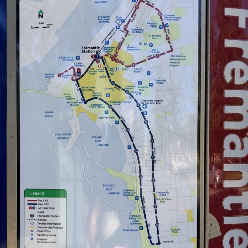 パースの中心部同様に、フリーマントルにも「Fremantle CAT」という無料の巡回バスがあります。レッドとブルーの2ルートがありますが、今回はブルーのバスに乗ってサウスフリーマントルを目指します。ブルーのCATバスは、10分毎に運行されてます。