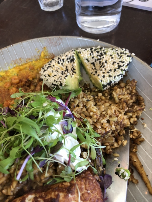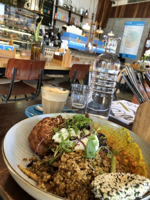 「ポートシティ・ロースターズ」はフリーマントルらしく、健康志向のメニューが盛りだくさん。写真は「Nourish Bowl(ノーリッシュ・ボウル)」というメニュー。大きなカリフラワーのローストに、ゴマで覆われたアボカド、そして近年注目されているスーパーフード「フリーカ」という青麦をローストして乾燥させたものの中には、アスパラガスとベイビーキャロットがゴロゴロ入っており、その上にはポーチドエッグが乗っています。添えられたひよこ豆のカレーがアクセントとなって全体をまとめているワンプレートです。素材の野菜の味を生かした、ヘルシーなディッシュです。