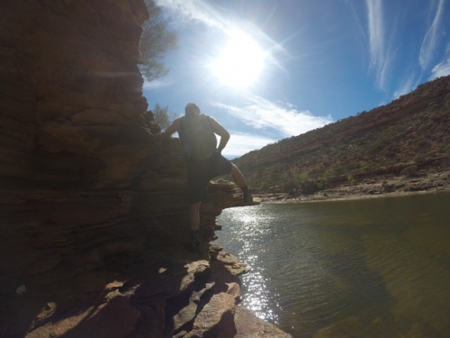 長い年月をかけて堆積された地層の岩場を歩いていきます。この辺りの川沿いのトレイルは冒険心をくすぐる楽しい場所であると同時に、アドバンスコースでもあるので慎重に。