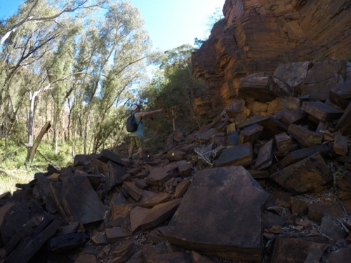 駐車場から渓谷を下り、しばらくはこのようなトレイルを歩きます。地殻変動や浸食により、20億年以上の年月をかけて創られた渓谷の地層は、天然のタイルのような岩となっており、ところどころ崩れ落ちている場所もあって、まるで荒廃した遺跡のようでもあります。
