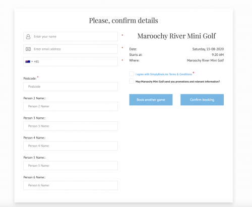 出典:maroochyriverminigolf.simplybook.me赤の*が必要事項(マルチリバー・ミニゴルフHPのスクリーンショット)