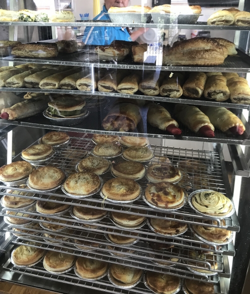 一番のおすすめは、街のパン屋さん(Bakary)です。ふつうミートパイはこんな風に保温用のショーケースに並べられています。
