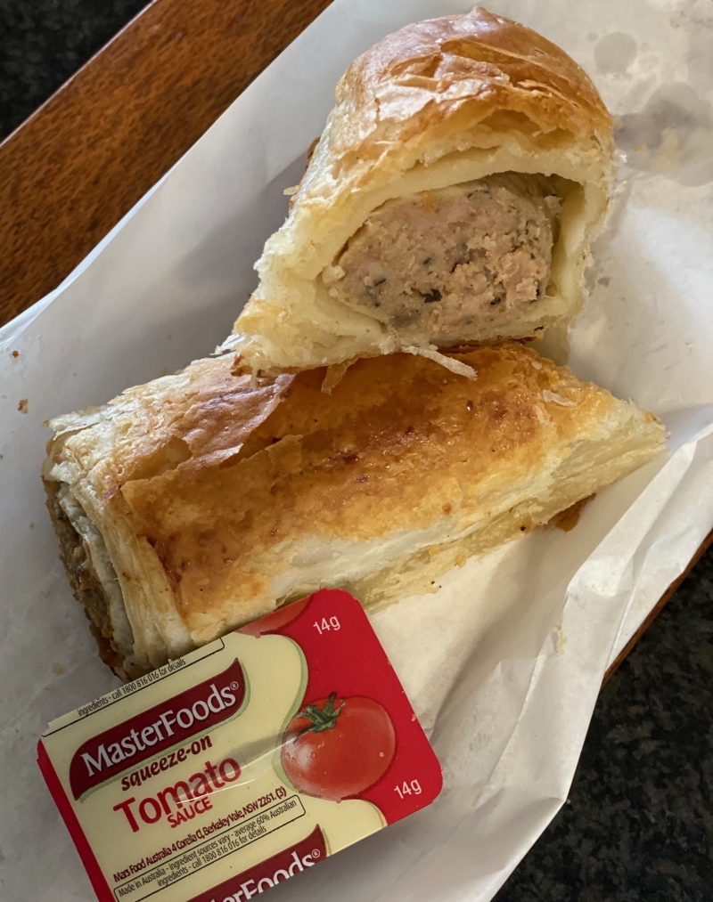 - Sausage Roll(ソーセージ ロール):パイと同じように人気なのが、このソーセージ ロール。ミートパイにはグレービーソースを使った具が入っていますが、こちらは汁気の少ない具をパイ生地で包んだものです。日本のソーセージとは違い、ハンバーグのような具が入っています。