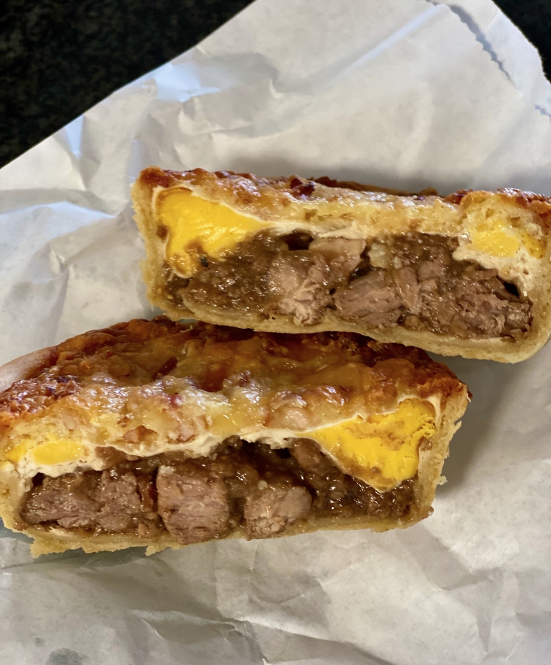 店によって名前はいろいろですが、もし、Meat Pie(ミートパイ)とか Mince Pie(ミンスパイ)とあったら、写真のような牛のひき肉を煮込んだものが入っています。