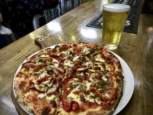 ビールも美味しいですが、このピザがまた美味しい!ピザのお値段はホール1枚17ドル〜25ドル(1,300〜1,900円)程度で、二人で食べて十分な大きさです。