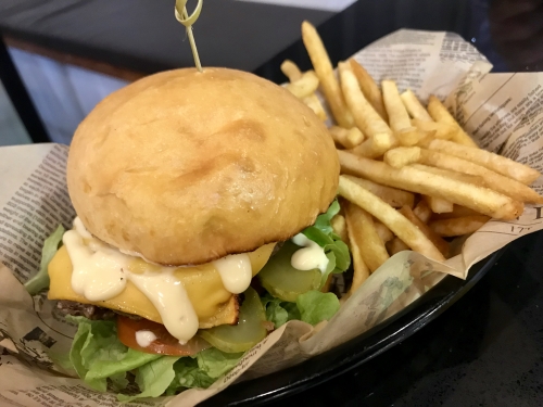 事務所のような外見とは異なり、内装はとてもシンプルでシック。工場内にキッチンがあるため、料理の種類も豊富です。ランチタイムにはこのバーガーとグラスビールを15ドル(1,140円)で提供。曜日によって変わるスペシャルメニューもオススメです。