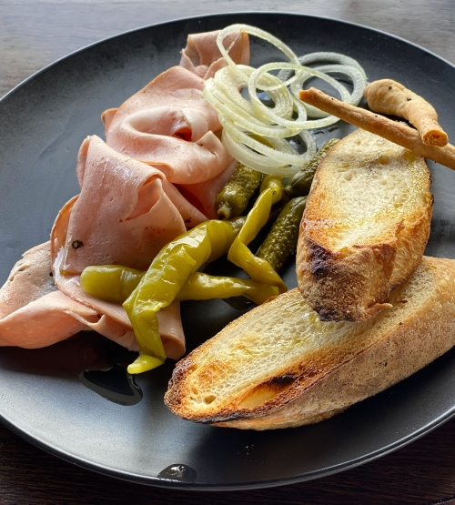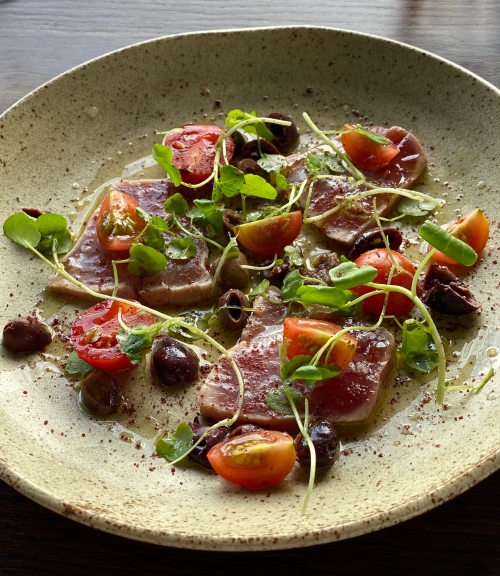 まずは前菜から。写真左は、プラウマンズ・ランチ(Ploughman's Lunch=ハムやピクルス、チーズなどをパンと共に食べるイギリスの定番ランチ)風の一皿。ハムがとても美味しいです。写真右は、まぐろのカルパッチョ風です。