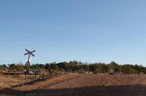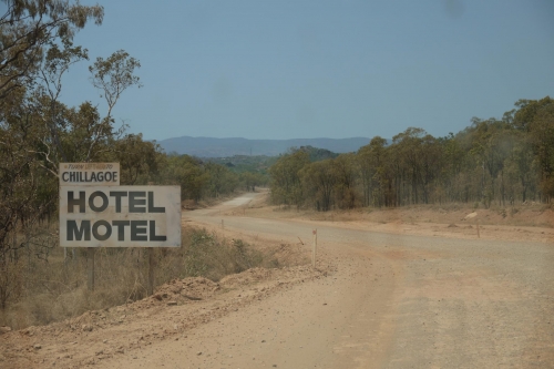 デンビューラ(Dimbulah)の街を過ぎたあたりから、赤茶けた乾燥地帯が続くようになります。これがアウトバックと呼ばれる荒涼とした内陸部の景色です。最後の30kmあたりは未舗装ですが、平坦なので、4WDの車でなくても大丈夫です。ただし、走行中に跳ねた小石が車にあたることがあるので、レンタカーを使う場合、保険はMaximum Coverにすることをお勧めします。