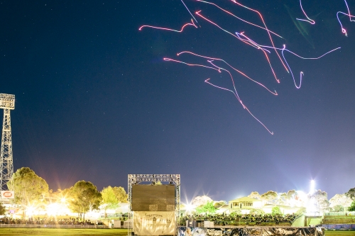続いて、地上で操縦士たちが集まっているかと思うと、一斉にそれぞれのドローンが空へと飛び立ちました。ドローンにはこちらもライトを備え付けており、何十台ものドローンが各々の動きをするのに合わせて光も面白い動きを演出します。