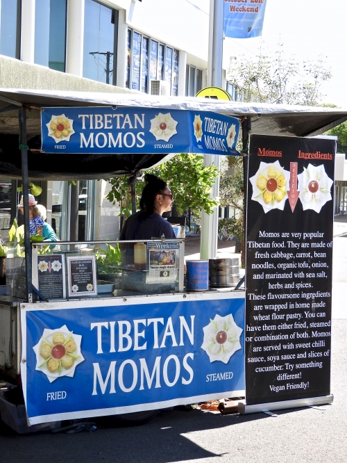 チベットの餃子「Momo」の屋台、もちろん日本の餃子も中国の餃子も売っています。各国の餃子のほか、アメリカ、ドイツ、オーストラリアのホットドックの食べ比べもなどもできます。