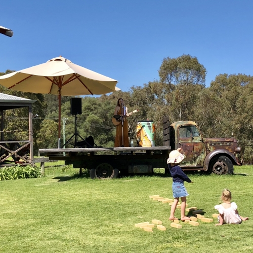 レストランは開放感のある素敵な空間で、葡萄畑を見下ろしながらのお食事は雰囲気抜群です。アウトドアエリアには子供達が駆け回れる芝生のスペースがあり、週末になるとローカルミュージシャンによるライブが行われます。