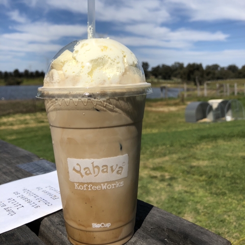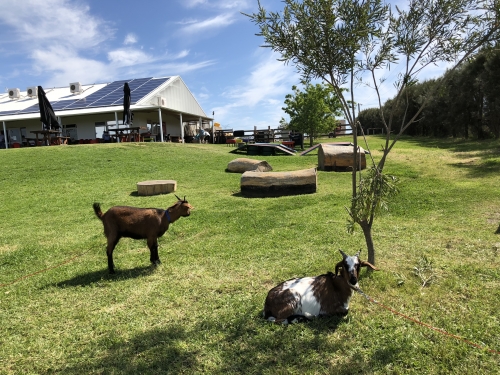 もちろんカフェエリアがあるので、その場でいただくことも出来ます。ちなみに写真はアイスコーヒーです。オーストラリアのアイスコーヒーは、アイスクリームと生クリームがたっぷり入っています。アウトドアエリアは、子供の遊具があったり、マスコットの子ヤギがいたりして、お子さんにも喜ばれそうです。
