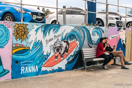 バスでボンダイロードからボンダイビーチへ向かうと、ボンダイビーチの美しい光景が現れます。ビーチが見えたら、そこから一番近いバス停で降りましょう。少し高台になっている丘の上からなら、ビーチ全体を写真に収めることができます。ビーチ沿いにはウォールアートがあるので、その前で写真を撮る人もたくさんいます。