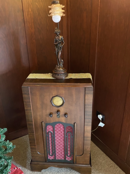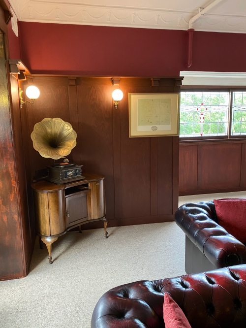 めちゃめちゃいい感じの図書室。皮張りのソファーといい、蓄音器やラジオといい、レトロな雰囲気がたまりません。