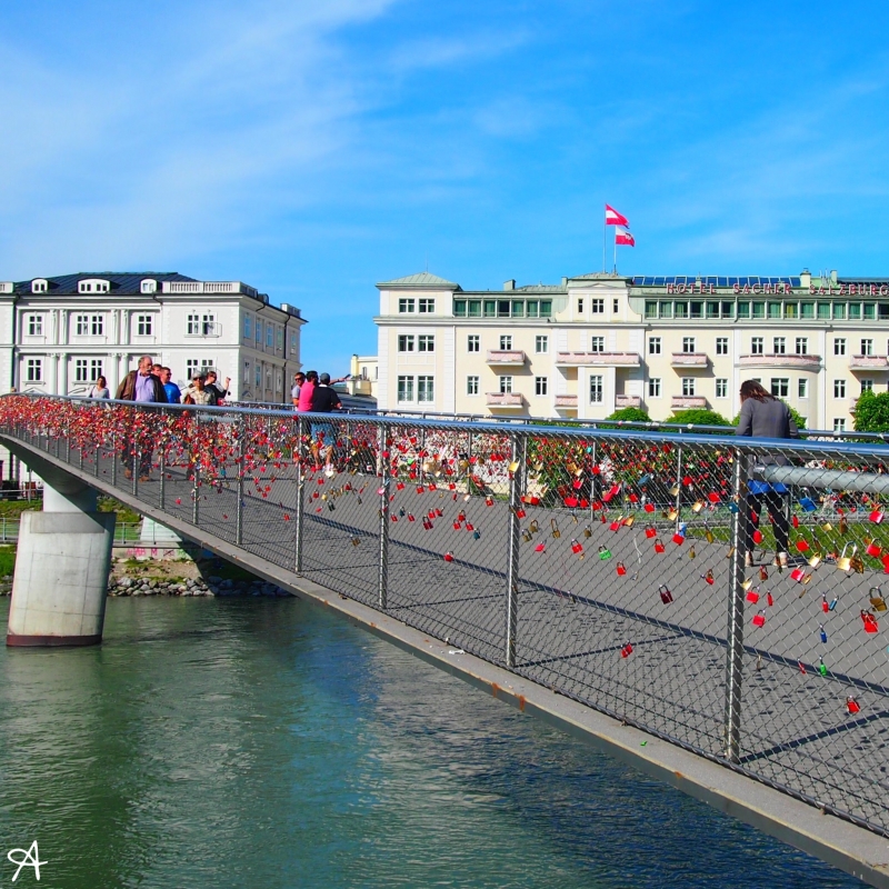 旧市街と新市街を結ぶ歩行者専用の橋です。橋には南京錠がたくさんつけられています。橋自体も可愛らしいですが、橋からの景色も素敵です。北西の方向は高い建物は少ないので、ザルツァハ川を中心にのどかな風景を写すことができます。