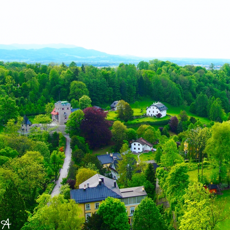 ザルツブルクの街を見渡せる場所②です。ここからは、ザルツブルク大聖堂が見えます。また、西側には緑の中に可愛らしい建物が点々と建っており、賑やかな旧市街とは違ったローカルな雰囲気の写真が撮れます。筆者は行きはケーブルカーで登り、下りは歩いて降りました。