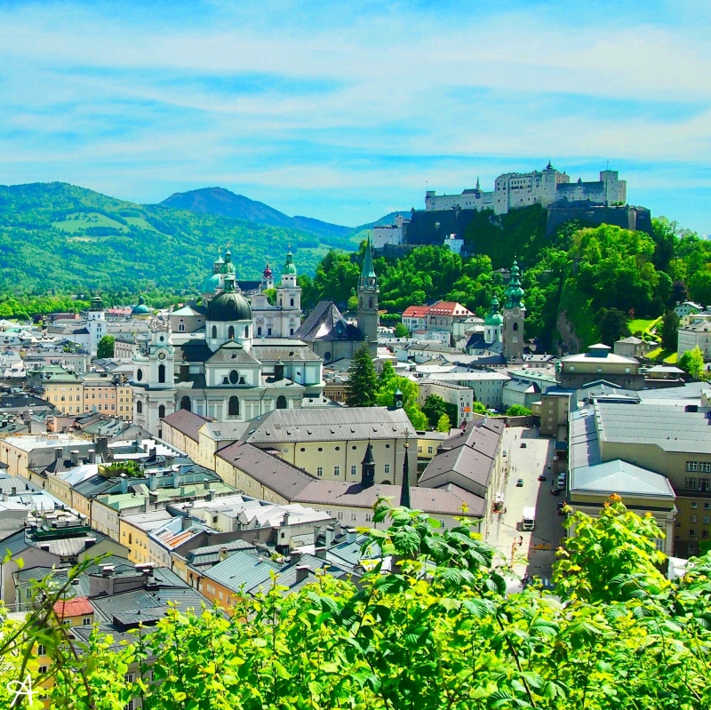 エレベーターでメンヒスベルクの丘に上がった所に近代美術館があり、美術館前のテラスからザルツブルクの町を一望することが出来ます。高台からザルツブルクの街を見渡せる場所は何箇所かありますが、そのうちの1つです。ここからはホーエンザルツブルク城が見え、クラシカルな雰囲気の写真が撮れます。