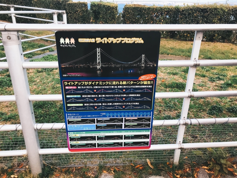 ちなみに、夜には明石海峡大橋がライトアップされて、また違った景色を眺めることができます。平日と土日でライトアップの仕方が変わっていたり、季節に合わせて変わったりと、いつ見ても美しいイルミネーションを見ることができますよ!