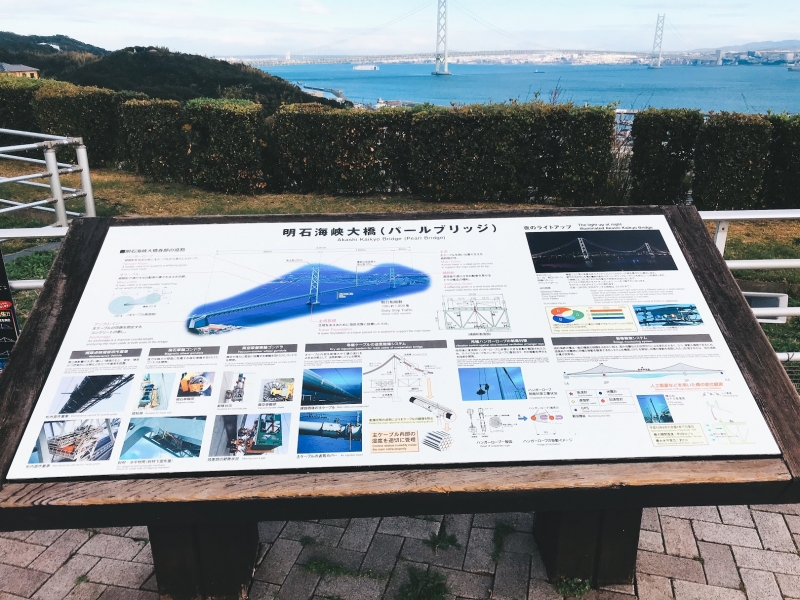 この丘の近くには、明石海峡大橋の構造を説明した看板もあります。色んなゴンドラを使用していたり、人工衛星から安全性を確認していたりと、私たちの目からは見えないところで、明石海峡大橋の安全性が保たれていることがわかります。世界最長たる理由を垣間見ることができますね。