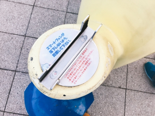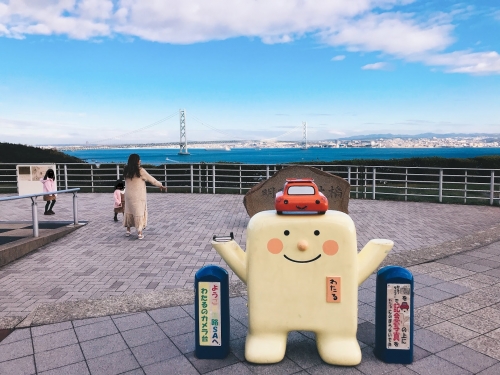 実は、石碑の前には記念写真の撮影を手助けしてくれる、本州四国連絡橋のシンボルキャラクター「わたる」がいます!わたるの頭と手にはそれぞれカメラや、スマホを置く台がついています。なので、セルフタイマーを使えば、誰でもみんな揃って写真を撮ることができるのです!