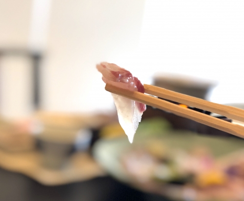 やっぱり最初は、お頭付きの豪華な「鯛の活造り」。鯛は、お客さまが席に着いてから水槽から出すので、さばきたてで新鮮!まだピチピチ動いています。面白がって顔をツンツンすると、指を噛まれちゃうかもしれないのでご注意を…と言いたくなるくらいイキがいいです。