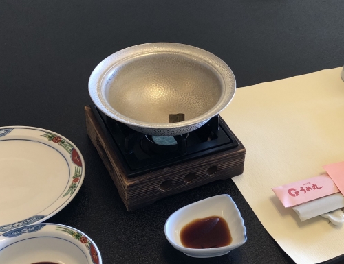 うす造りも普通に醤油をつけて食べても良いですが、セッティングにある小鍋でしゃぶしゃぶも楽しめます。しゃぶしゃぶはあまり火を通さないのがポイント。半ナマ状態でぜひポン酢で味わってみてください。お刺身とはまた違う美味しさが味わえます。