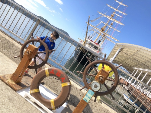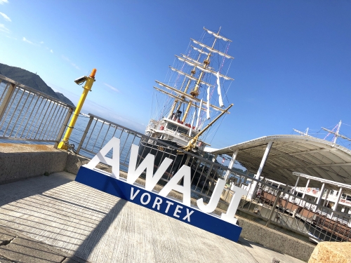 咸臨丸 を背景に「AWAJI」や、キャプテン席のようなオブジェがあります。ベタではありますが、観光にきたー!という記念写真が撮れます。