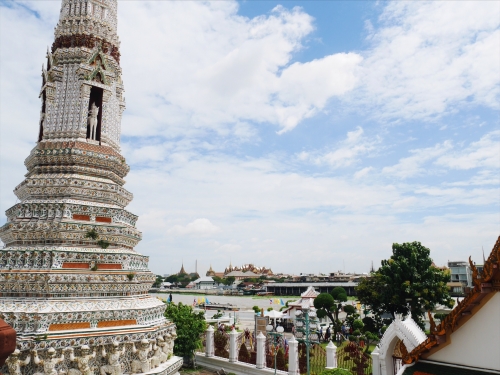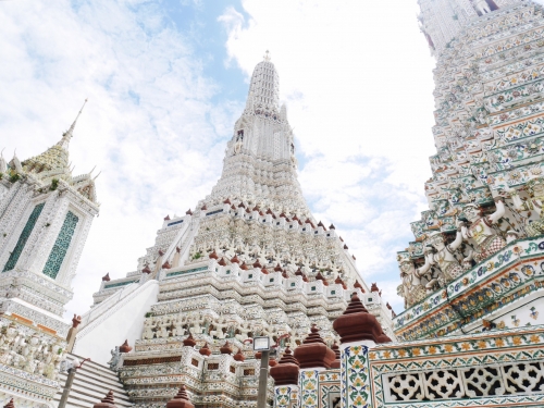 最後はワット・アルン。ここを一言で表すと「白!」という感じです。青い空に映える白い仏塔は、日が暮れると美しくライトアップされることでも有名です。こちらにある仏塔は、途中まで階段で登ることができ、少し高いところからバンコクの景色を眺められるスポットでもあります。