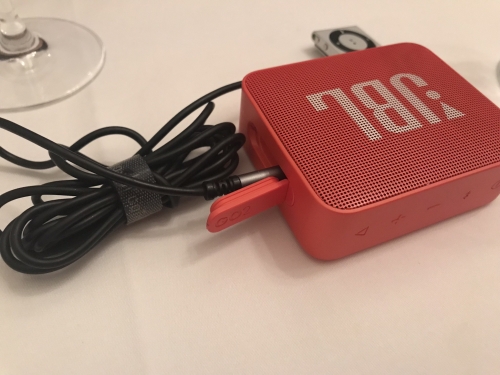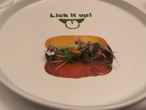 最初の1品は、ロックなミュージックが流れるスピーカーと一緒にいただきます。ノリノリな気分になったところで出てきたのは、「Lick it up!(舐め上げて)」とお皿に書いてある前菜。